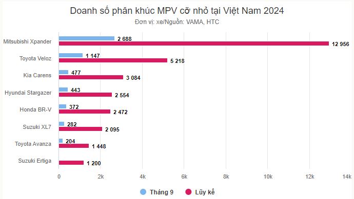 Tháng 9/2024, Xpander bán ra 2.688 xe, con số của hai mẫu MPV Toyota là 1.351 xe. Lũy kế từ đầu năm, sản phẩm của Mitsubishi đạt 12.956 xe, gần gấp đôi doanh số của Avanza và Veloz (6.666 xe).