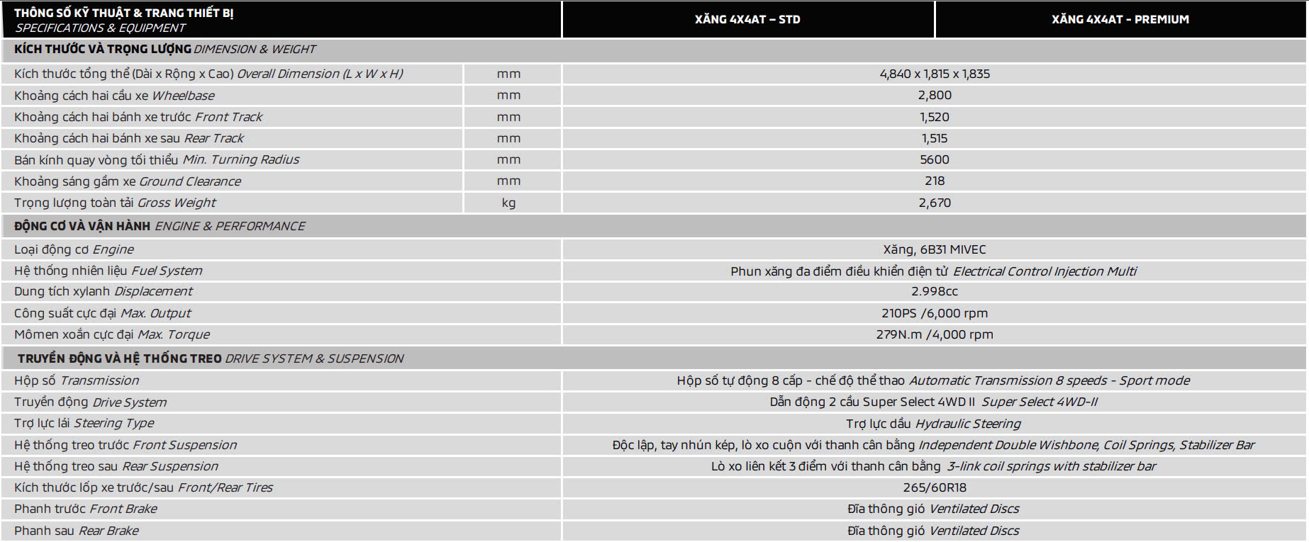 | THÔNG SỐ KỸ THUẬT & TRANG THIẾT BỊ SPECIFICATIONS & EQUIPMENT | XĂNG 4X4AT – STD | XĂNG 4X4AT - PREMIUM | |