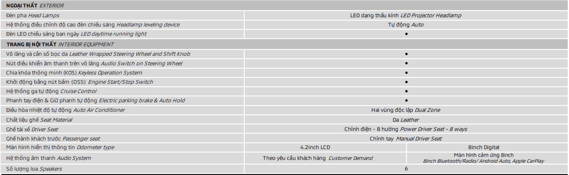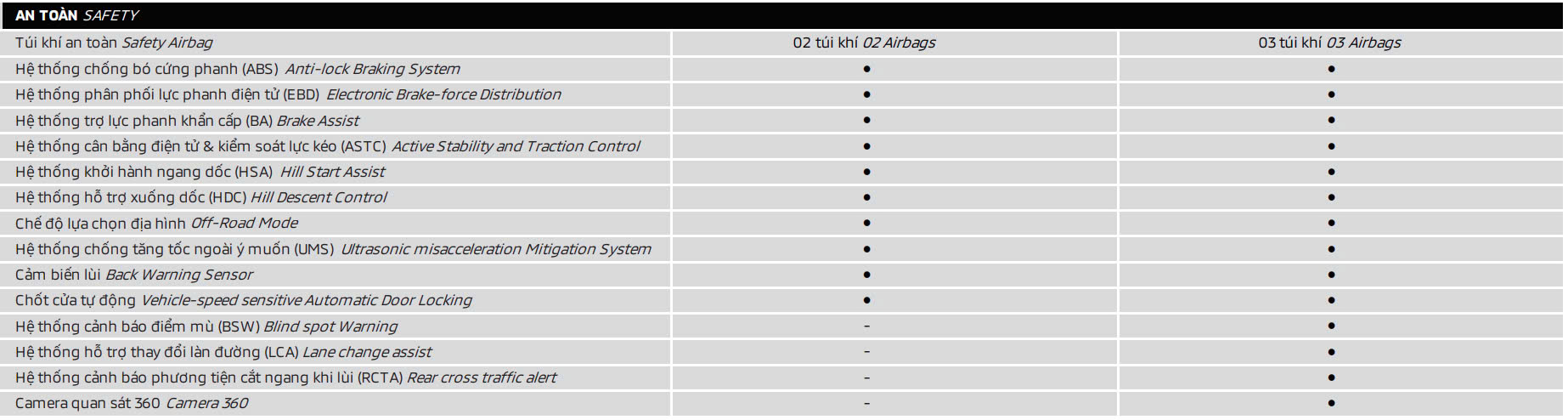 | Túi khí an toàn Safety Airbag | 02 túi khí 02 Airbags | 03 túi khí 03 Airbags | |