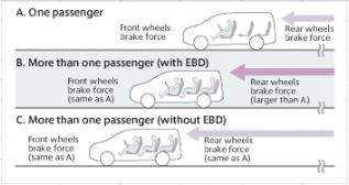 Với hệ thống EDB, việc phân phối lực phanh giữa các bánh trước và sau sẽ được tối ưu và lực phanh sẽ là tối đa bất kể điều kiện tải trọng. Ví dụ như: khi có nhiều hành khách trên xe thì tải trọng sẽ đặt lên bánh sau tăng lên. Hoặc khi phanh gấp với nhiều hành khách trên xe, EBD nhận biết được tình trạng này và tăng lực phanh lên bánh sau. Hiệu quả phanh sẽ tăng đáng kể so với xe không có tranh bị EBD.