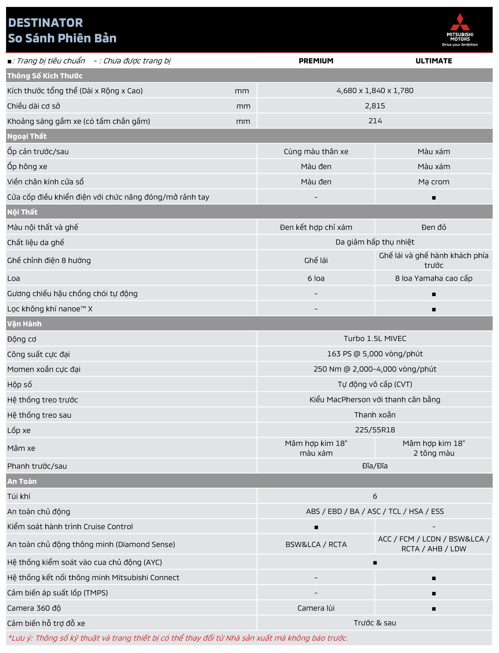 | BẢNG SO SÁNH THÔNG SỐ KỸ THUẬT HAI PHIÊN BẢN MITSUBISHI DESTINATOR | ||