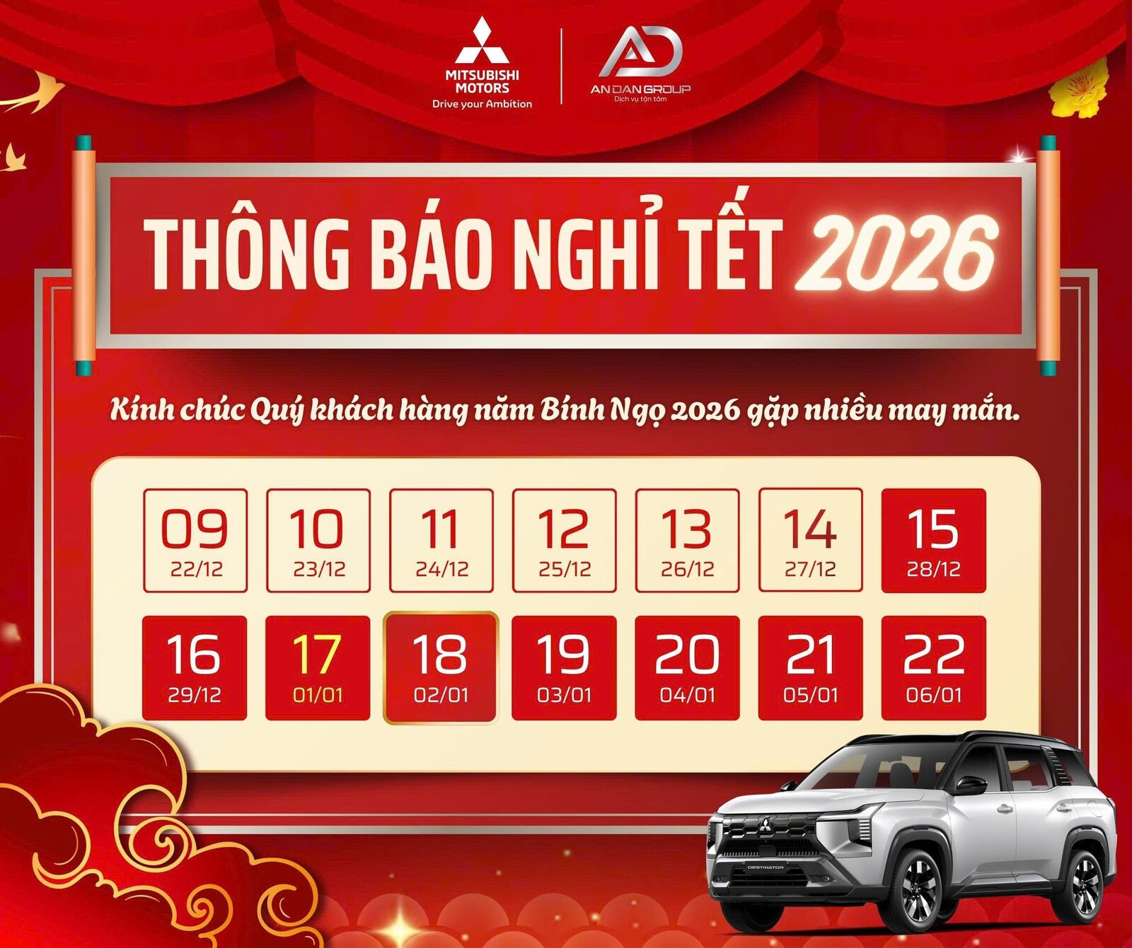 Mitsubishi An Dân Hà Nội trân trọng thông báo lịch nghỉ Tết Nguyên đán 2026 như sau: