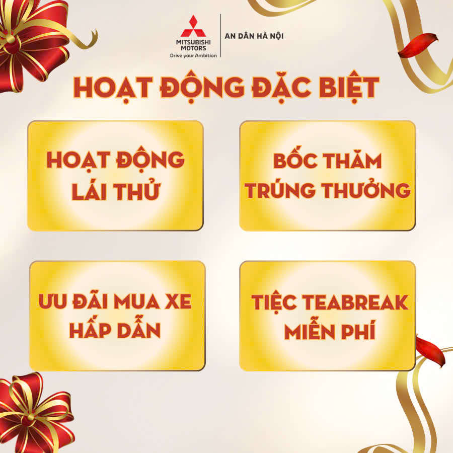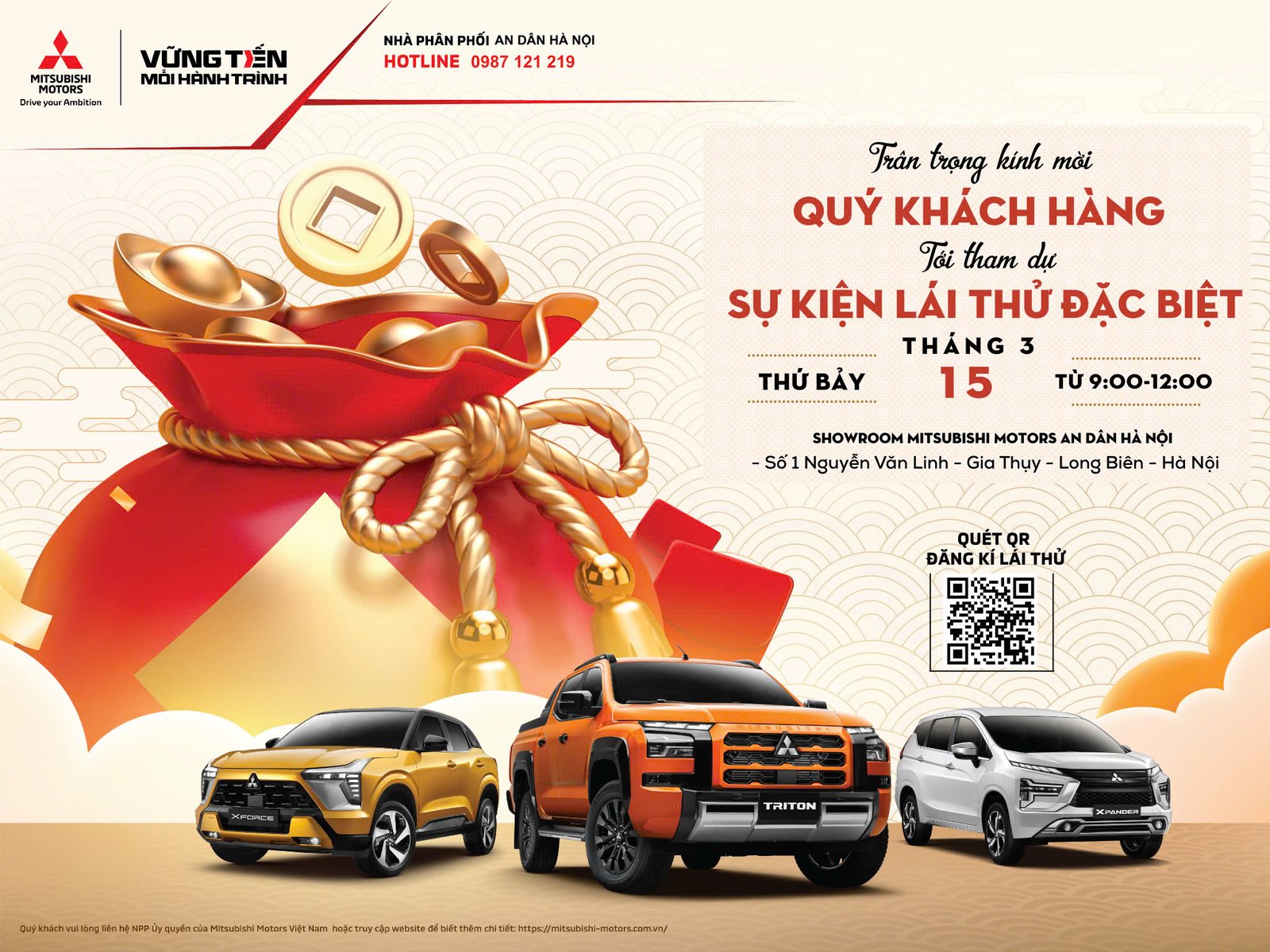 Mitsubishi An Dân Hà Nội trân trọng kính mời Quý khách hàng đến tham dự SỰ KIỆN LÁI THỬ THÁNG 3 – nơi Quý khách không chỉ được trải nghiệm thực tế những mẫu xe Mitsubishi mạnh mẽ, hiện đại mà còn nhận ưu đãi hấp dẫn và quà tặng giá trị.