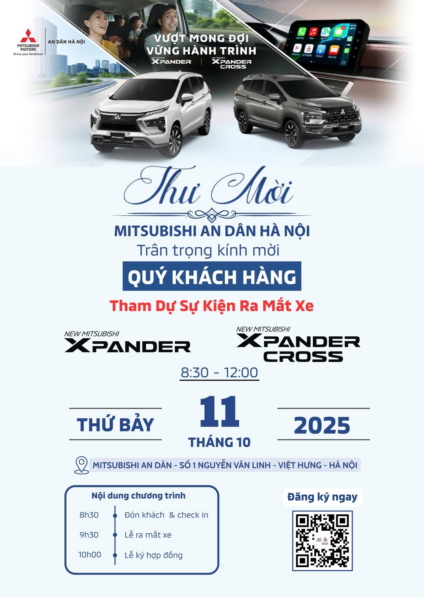 Kính gửi Quý Khách hàng, Mitsubishi An Dân Hà Nội trân trọng kính mời Quý khách tham dự Lễ ra mắt bộ đôi MPV thế hệ mới – Mitsubishi Xpander & Xpander Cross 2026.